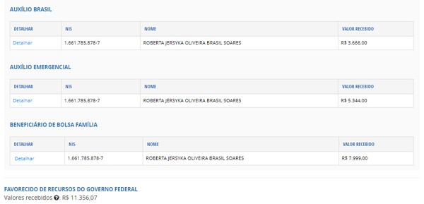 Dados do Portal da Transparência do governo federal mostram que Roberta recebeu, ao menos, R$ 11,3 mil referentes aos seguintes benefícios sociais: