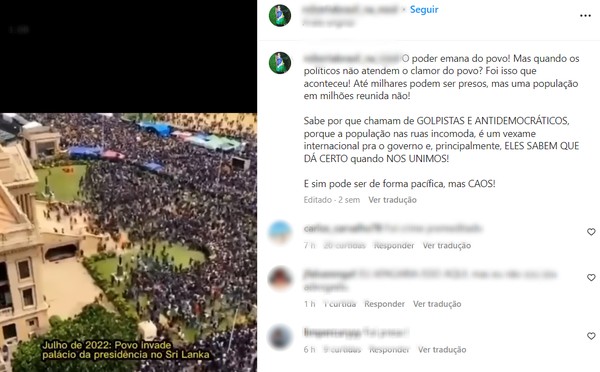 Em outra publicação, de 4 de janeiro, a estudante citou a invasão do palácio presidencial no Sri Lanka, em julho de 2022, como exemplo de o que deveria ser feito no Brasil (veja post abaixo):