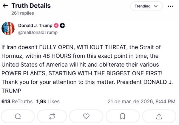 Trump faz nova ameaça ao Irã — Foto: Reprodução/Truth Social @realDonaldTrump